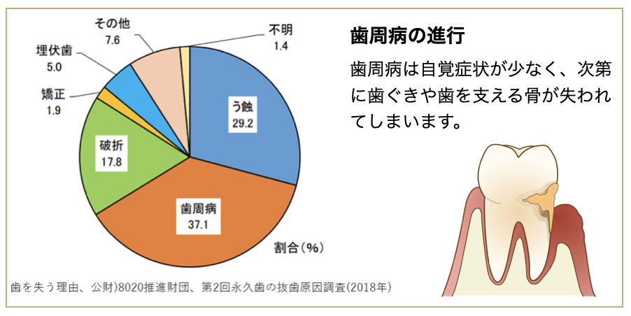 歯科医院を受診する多くの理由に「歯の痛み」があることから、歯を失う原因も、むし歯が一番多いと予想してしまう方もいらっしゃると思いますが、歯を失う原因で最も多いのは歯周病です。