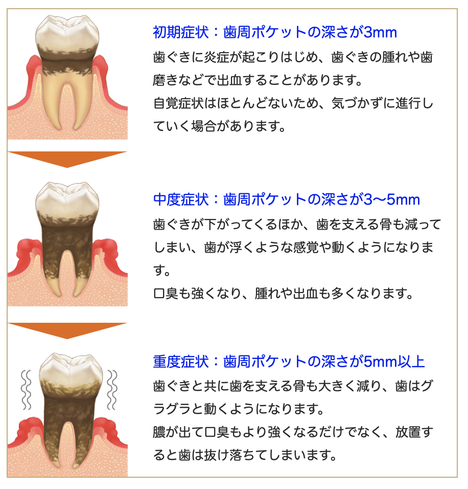 歯周病の進行度は大きく分けて、軽度(初期症状)、中度、重度の