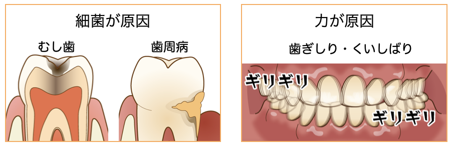 力は、歯や顎にかかる過度な負担により、歯が割れたり、顎関節症などさまざまな問題に派生する原因となります。