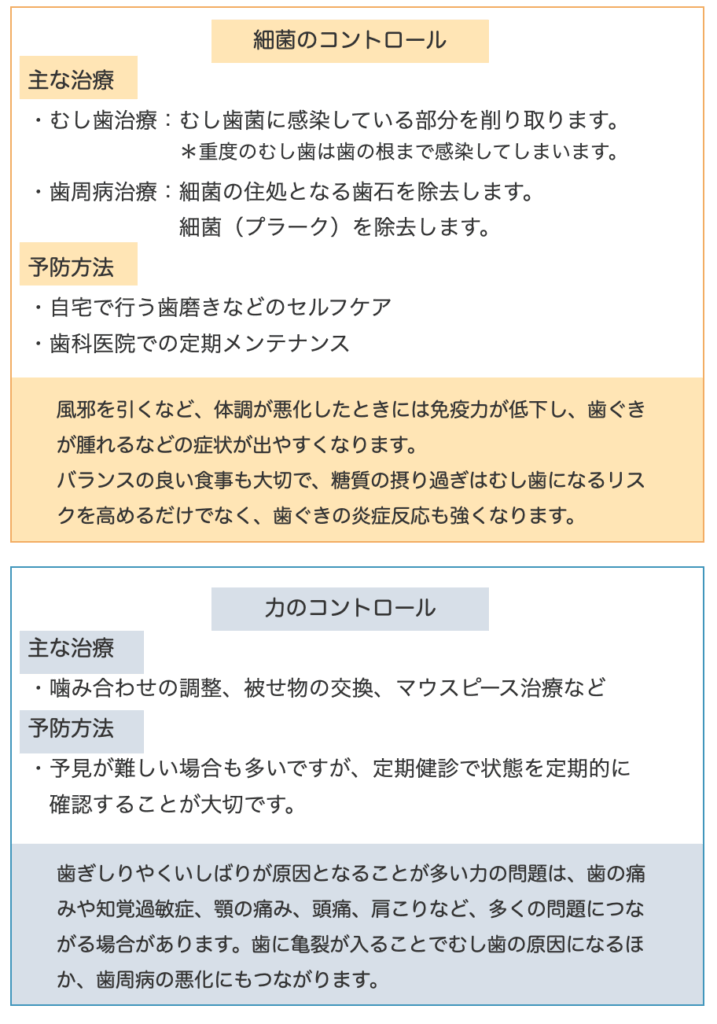 細菌のコントロールと力のコントロールは、口腔の問題を予防するだけでなく、治療においても原因となる細菌を取り除くことや、力のバランスを適正にすることが目的となります。